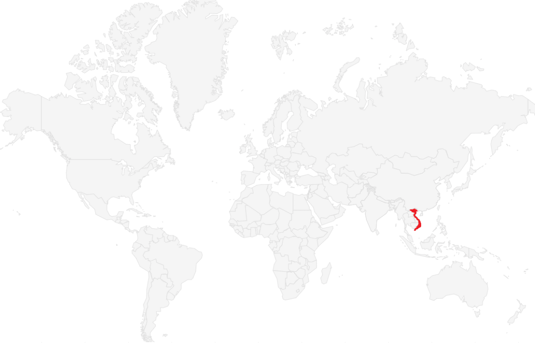 Located in Southeast Asia, the geography of Vietnam consists of a flat coastal plain which becomes a high mountain range along its border. Most of its terrain is densely forested with the exception of its flat planes which are mainly used for agriculture. In total, Vietnam borders three other states with China to the north and Laos and Cambodia to the west. To the east and south, it is located on the South China Sea.